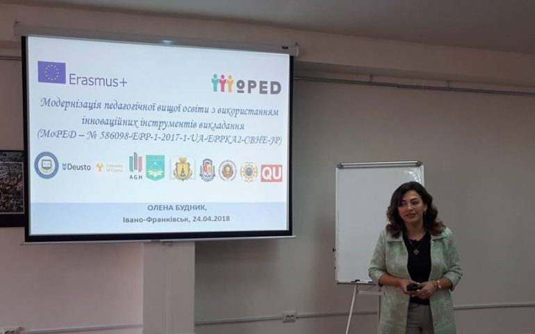 24 квітня 2018 року на кафедрі професійної освіти та інноваційних технологій ДВНЗ «Прикарпатський національний університет імені Василя Стефаника» відбулася інформаційна зустріч-презентація проекту ERASMUS+ «MoPED – Модернізація вищої педагогічної освіти з використання інноваційних інструментів викладання» (№ 586098-EPP-1-2017-1-UA-EPPKA2-CBHE-JP) в рамках науково-методичного семінару “Нова Українська школа і система післядипломної педагогічної освіти”.;