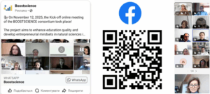 3 грудня 2025 року відбулася друга онлайн-зустріч консорціуму проєкту BOOSTSCIENCE – «Boosting Education Quality and Entrepreneurial Mindsets for Natural Sciences in Ukraine»(«Підвищення якості освіти та підприємницького мислення у сфері природничих наук в Україні», 101237769 – BOOSTSCIENCE – ERASMUS-EDU-2025-CBHE-STRAND-2), що реалізується в межах напряму Erasmus+ KA2: Capacity Building in Higher Education (CBHE) з 01 листопада 2025 року по 31 жовтня 2028 року.